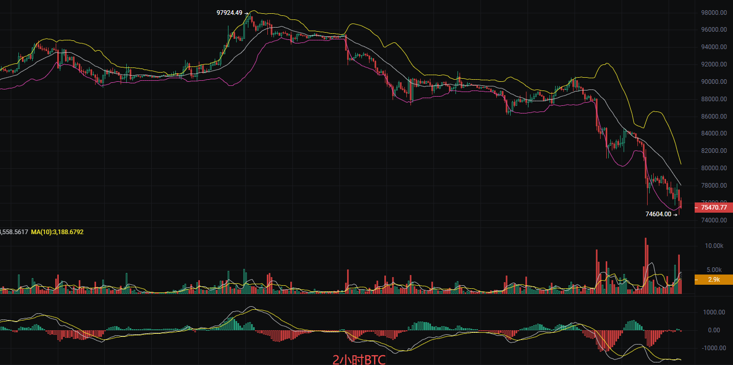 The current price of Bitcoin is 75,700. The main force continues to liquidate positions, breaking the previous low once again. The daily price has been continuously declining recently, forming multiple bearish candles, with a significant drop and strong bearish momentum. The 2-hour K-line shows a downward trend with weak rebound strength, making multiple unsuccessful attempts to rise, resulting in long upper shadows, indicating heavy selling pressure above. The MACD on the 2-hour chart is dominated by bears. The daily level is also in a death cross state, with obvious bearish momentum. The RS on the 2-hour chart has not entered the extreme area of oversold; the EMA short-term, medium-term, and long-term moving averages are all in a bearish arrangement. It is now a consensus that the bear market has begun, and according to the bull-bear cycle in the crypto circle, we are currently only in the early stage of the bear market.