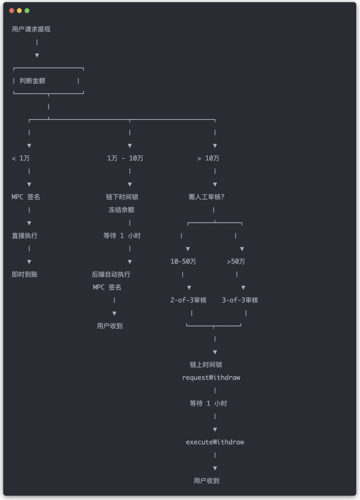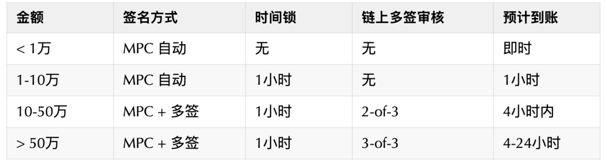 I divided the withdrawal amounts into four levels. The first level is for small withdrawals, which can be signed directly by the backend Signer. However, to ensure the security of the backend Signer's private key, I plan to integrate Fireblocks' MPC wallet to avoid the Signer coming into contact with the private key while also enabling automation.