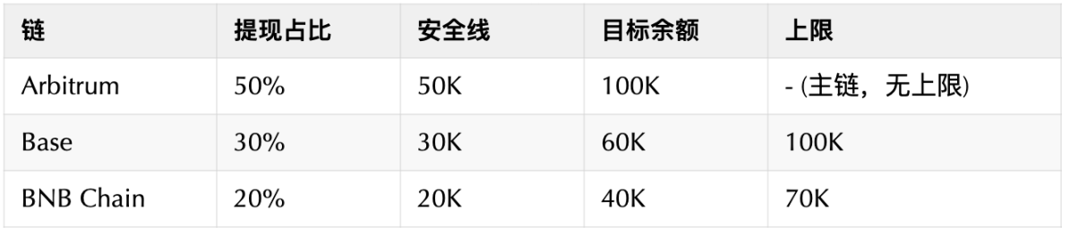 A scheduled task can be set up, for example, to check the asset amounts on each chain's contract every hour. If it detects that the balance on a certain chain is below a safety line, it will supplement the target balance from a surplus chain. For instance, if the rebalancing task finds that the balance on Arbitrum is only 40K, while there is 100K on the Base chain, it will transfer 60K of USDC from the Base chain to Arbitrum. After the transfer, the Base chain will still have 40K, which is above the safety line.