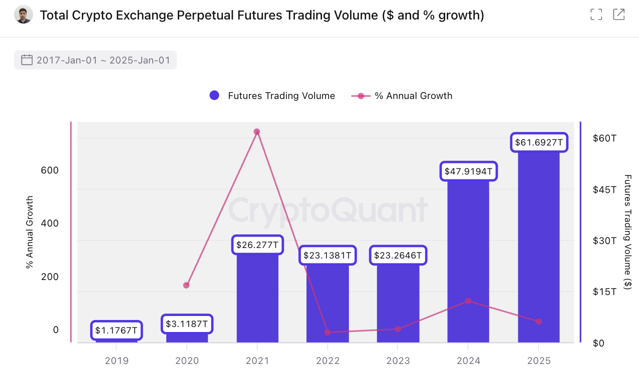 This point can be referenced from the experience of the crypto market. In the past few years, perpetual contracts have become one of the core trading structures in the crypto derivatives market. According to CryptoQuant data, the overall trading volume of the global crypto market is close to $79 trillion by 2025. Among this, the trading volume of perpetual contracts is about $61.7 trillion, while the spot trading volume is approximately $18.6 trillion. Structurally, perpetual contracts have become the dominant trading form in the crypto market, with a trading volume approximately 3.3 times that of the spot market. Furthermore, by 2025, the trading volume of perpetual contracts is expected to reach about $61.7 trillion, setting a historical record, which is an increase of about 28.7% compared to $47.9 trillion in 2024. At the same time, since 2019, the trading volume of perpetual contracts has maintained a stable upward trend, reflecting the market's long-term preference for this derivative trading structure and the continuously increasing participation. This also indicates that as long as an asset has sufficient liquidity and price volatility, the market is highly accepting of the "perpetualization" trading form itself.