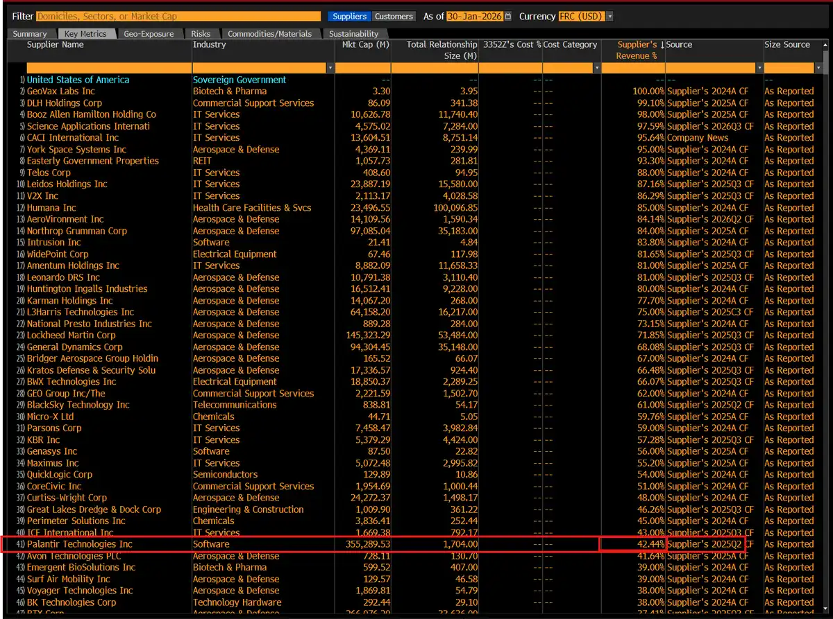 Palantir 之所以关键,正在于这家公司正逐步成为美国联邦政府反欺诈体系的「操作中枢」。目前,Palantir 42% 的收入来自美国政府,其技术正被部署到多个政府部门,用于识别和遏制大规模欺诈行为以及过度、低效的政府支出。