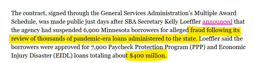 在排查疫情期间的贷款项目时,SBA 发现明尼苏达州存在大规模违规行为:涉及 6,900 名借款人、约 7,900 笔 PPP 与 EIDL 贷款,总金额约 4 亿美元。