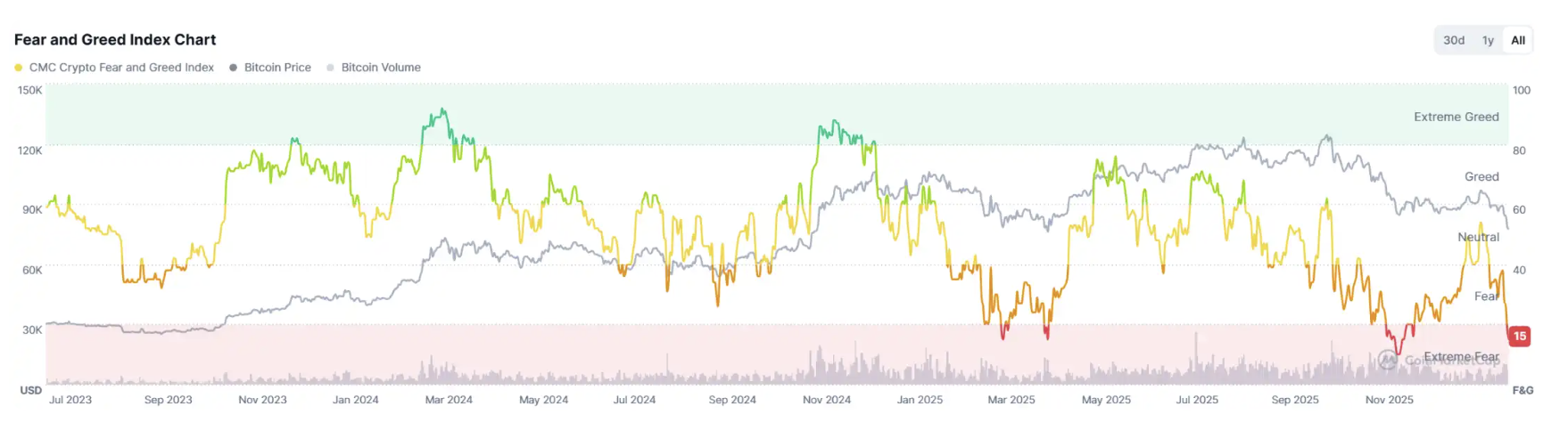 The market fear index is at 15, and market sentiment has once again plunged into extreme fear.