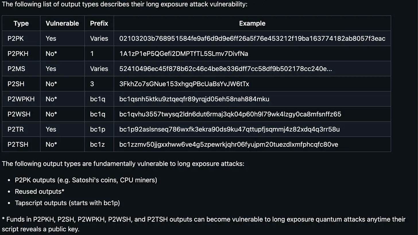并非所有比特币都面临同样的风险。早期的点对点K(公钥支付)地址(包括中本聪的地址)的公钥直接显示在账本上。对于这些比特币,量子计算机无异于一把可以直接进入钱包的“万能钥匙”。相比之下,后来的地址类型(如 点对点KH)将公钥隐藏在加密哈希之后,只有在发起交易时才会暴露公钥。这创造了一个短暂的漏洞窗口:在你为了转账而揭示公钥,到交易被矿工打包确认之间,理论上性能足够强大的量子计算机可以在此期间进行拦截