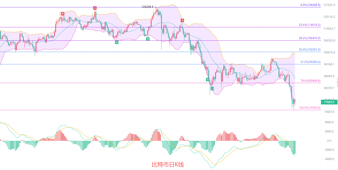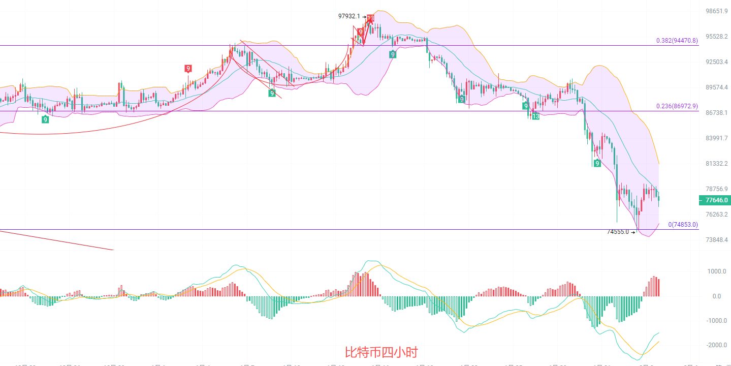 日K线发稿前最高79163,最低77000,EMA趋势指标南下趋势不变,EMA15趋势快线已经来到了84000附近,MACD缩量减少,DIF和DEA向下扩散已经走出了能量指标,布林带下轨已经到了76200,SRI在极端超卖边缘,整体趋势上南下不变