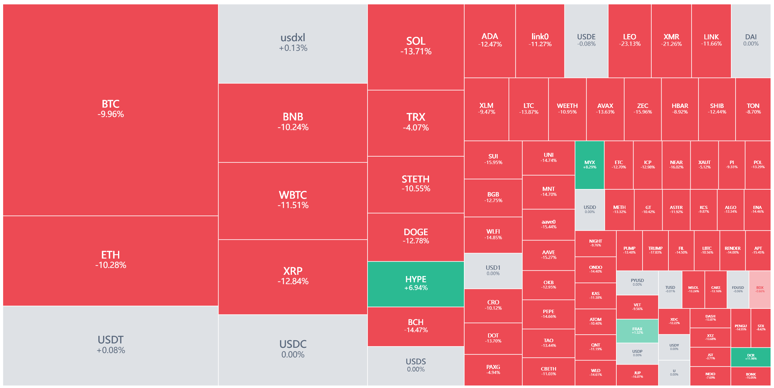 以太坊跌幅更大,超过13%;XRP更是暴跌超22%;SOL、狗狗币和BNB等其他主流加密货币跌幅均超过14%。