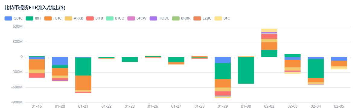 机构资金流向的变化也加剧了抛售压力。比特币交易所交易基金在周一录得约5.62亿美元净流入后,接下来两个交易日有超过8亿美元资金流出。