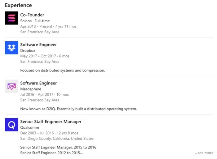 Anatoly Yakovenko's academic background focused on distributed systems and compression algorithms, which later proved critical to his innovations in the blockchain space. According to information disclosed by LinkedIn (as shown below), after graduation, he smoothly joined Qualcomm, where he worked on operating system-level software and distributed systems for over ten years, essentially doing the "heavy lifting," but this experience at a leading communications technology company also allowed Anatoly Yakovenko to accumulate deep expertise in building large-scale, high-throughput systems.