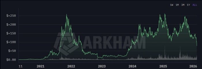 Over time, Anatoly Yakovenko's net worth is likely closely related to Solana's market performance, experiencing significant volatility in its stock price (the chart below illustrates the price trend of Solana tokens in recent years). In November 2021, when the SOL price reached approximately 260 dollars at a cyclical peak, the combined value of the tokens and company equity he held could have pushed his net worth above 2 billion dollars, potentially nearing 3 billion dollars, depending on the value of his shares in Solana Labs.
