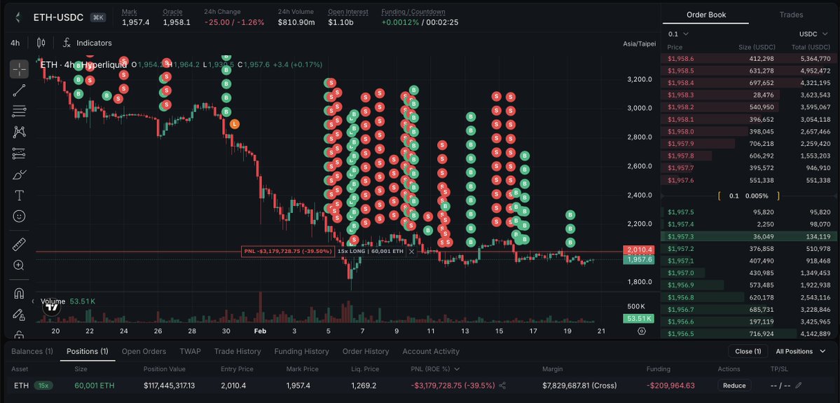 It appears that the two largest ETH longs on HL are controlled by the same entity. Trader 0xa5B, the largest ETH long on the platform, shares the same funding method, trade direction and source wallets as the second largest ETH long on HL.