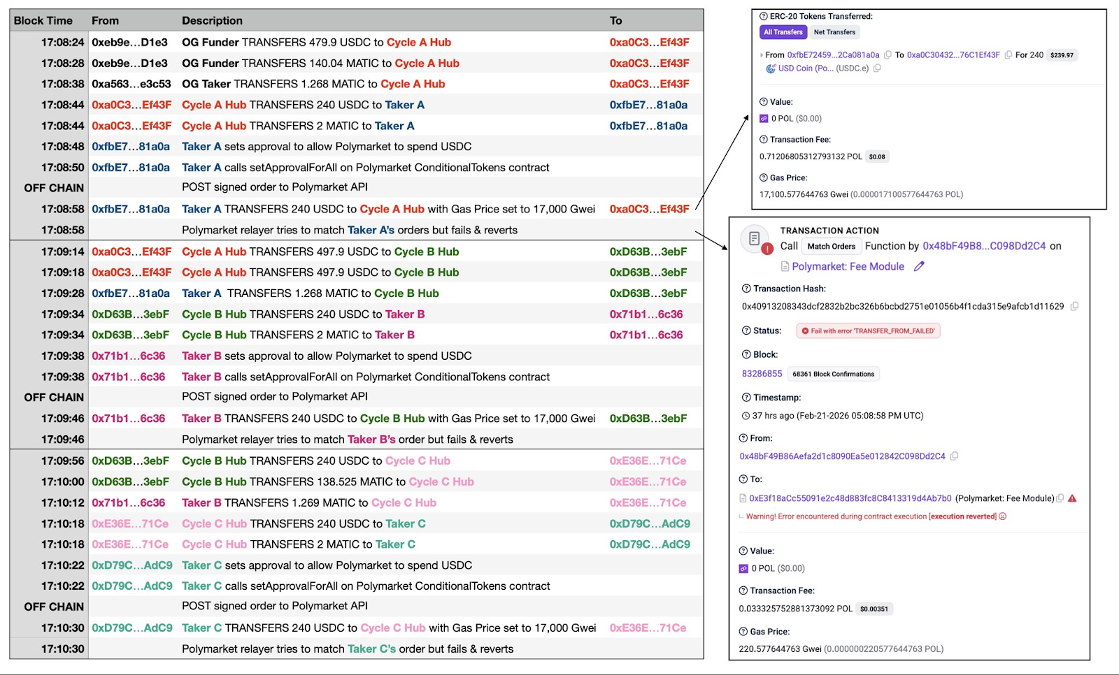 From a cost perspective, each attack cycle only needs to pay less than $0.1 in Gas fees on the Polygon network, and each cycle takes about 50 seconds, theoretically allowing around 72 cycles per hour. One attacker built a “dual wallet cycling system” (Cycle A Hub and Cycle B Hub operating alternately), achieving fully automated high-frequency attacks. Hundreds of failed transactions have already been recorded on-chain.
