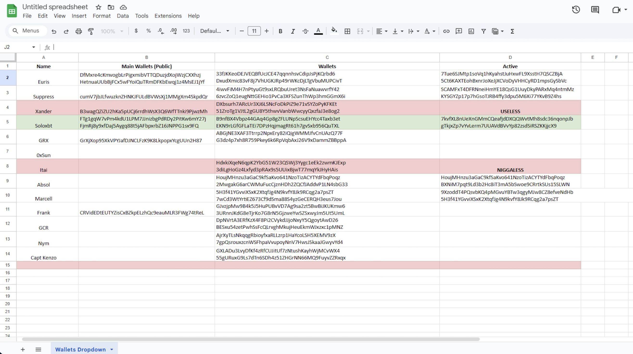 The group established a Google Spreadsheet compiling wallet addresses of multiple KOL targets. These addresses were organized from data obtained by Broox from Axiom's internal backend.