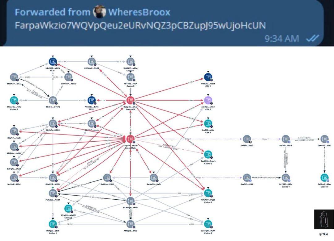 Through private chat messages, Broox's main wallet was identified, with all directly associated addresses mapped out.