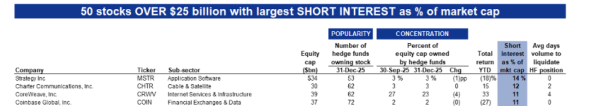 The article shows that the median short position among S&P 500 index constituents has risen to 2.7%, reaching one of the highest levels in nearly a decade. Among all constituents, Strategy has the highest short position at 14% of its market value, while Coinbase ranks fourth at 11%. This indicates that among all companies in the U.S. with a market capitalization of over $25 billion, Strategy is the least favored.