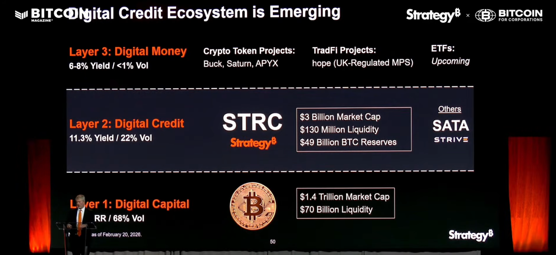 The third layer is "digital currency," which includes currencies for trading, such as stablecoins, issued based on the financial products in the second layer. The Saturn mentioned in the image plans to issue a stablecoin called USDat based on STRC and U.S. Treasuries, and this project has received investment from YZi Labs.