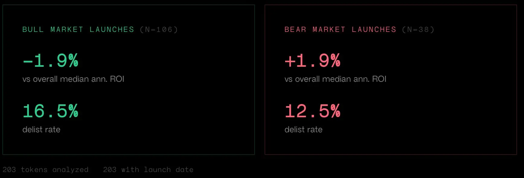 Dragonfly 管理合伙人 Haseeb 近期在 X 平台发文表示,通过使用 Claude Code 工具分析币安公告的所有代币发射数据,研究结果显示,在牛市与熊市期间上线的代币在统计学表现上没有显著差异。