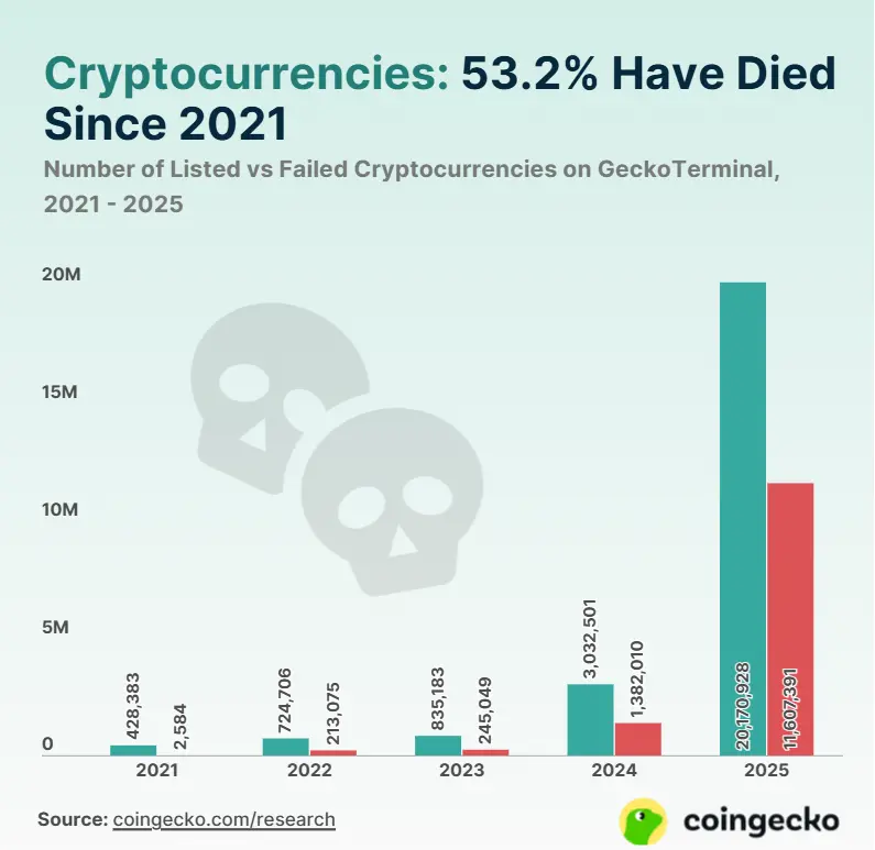 Coingecko 数据显示,截至 2026 1 月中旬,GeckoTerminal 平台上 53.2% 的加密货币已归零,2025 年共有 1160 万代币归零,占 2021 2025 年间归零代币总量的 86.3%。其中,第四季度就有 770 万枚代币崩盘,占所有已记录项目失败案例的 34.9%