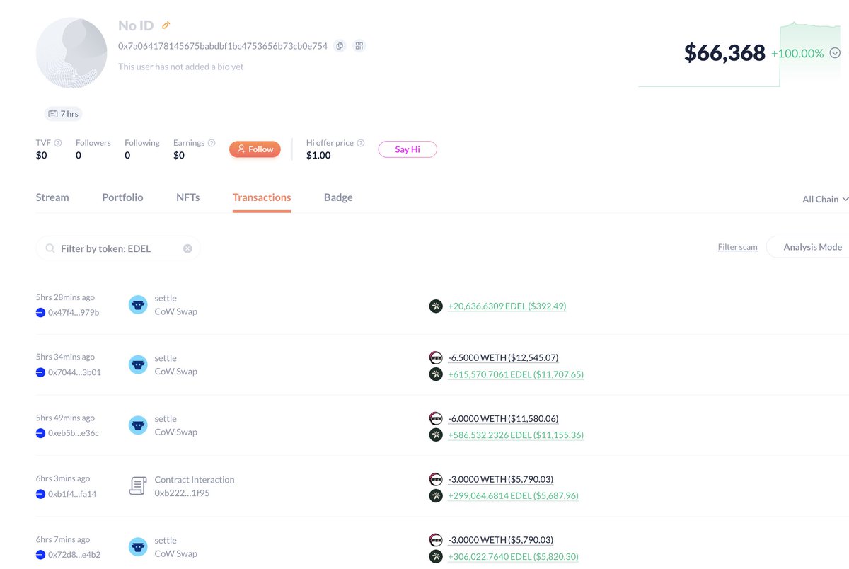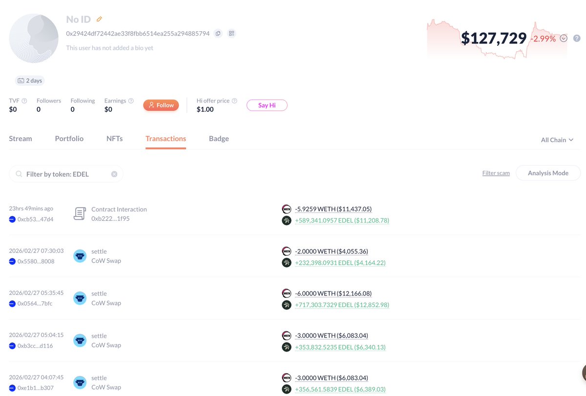 钱包 0x2942 在两天前创建,花费 50.75 $ETH($103K)购买了 6.7M $EDEL。