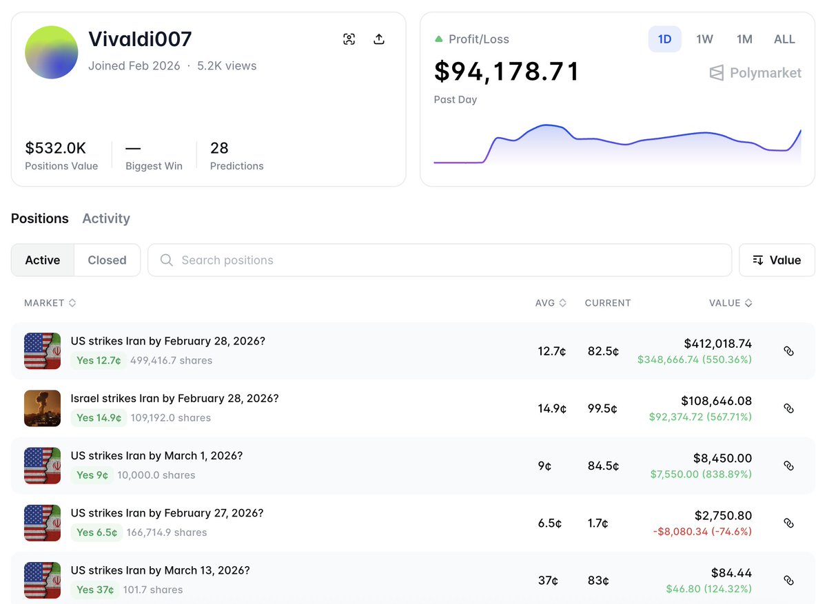 Trader Vivaldi007 joined #Polymarket on Feb 8 and started betting that the U.S. and Israel would attack Iran.