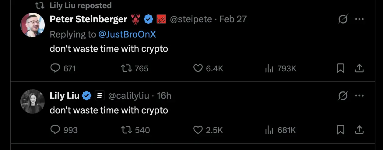 开源项目 OpenClaw 创始人 Peter Steinberger 昨日在 X 上回应用户提问,“对20多岁的年轻人有什么建议?”他的回答只有一句话:“don't waste time with crypto(别在加密货币上浪费时间)。”这条推文随后被 Solana 基金会主席 Lily Liu 转发,且她本人也同步发了内容完全一致的一句话。