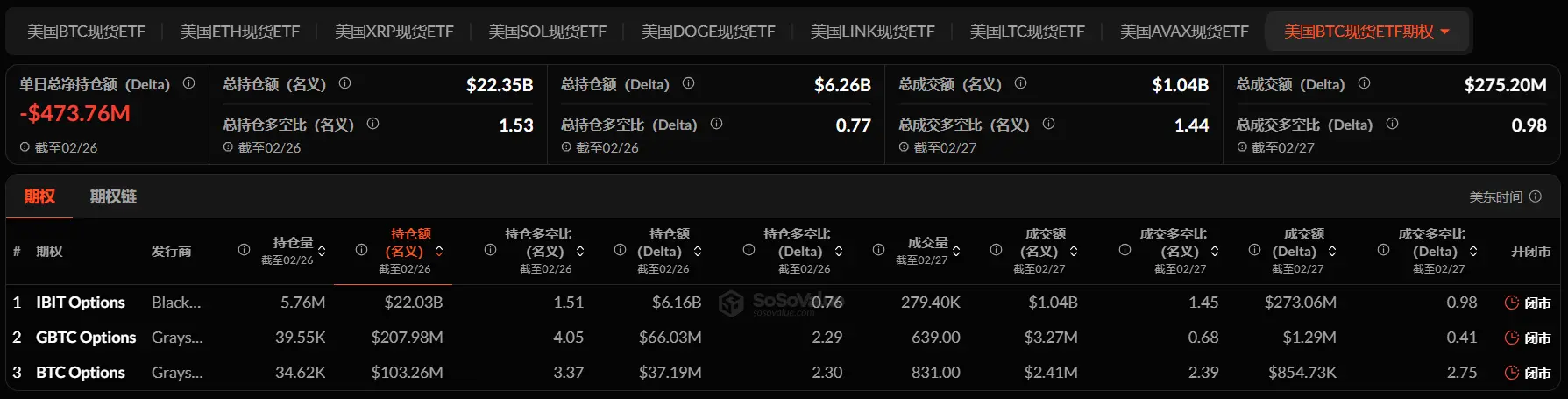 截至 2 月 26 日,美国比特币现货 ETF 期权名义总持仓额达 223.5 亿美元,名义总持仓多空比达 1.53。
