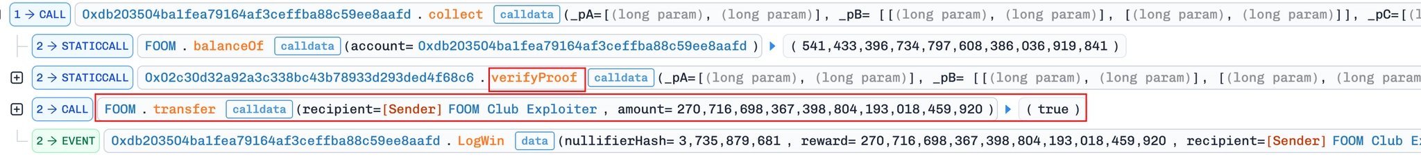 事件详情:2 月 26 日,Base 链和 Ethereum 链上的 FOOMCASH 项目遭遇模仿攻击(copycat attack),攻击者利用与此前 Veil Cash 事件类似的 zkSNARK 验证密钥配置错误(Groth16 验证器参数设置不当),成功伪造证明并盗取大量代币。其中,Base 链损失约 42.7 万美元,Ethereum 链损失约 183.3 万美元(部分资金疑似被白帽救援),总损失约 226 万美元。事件发生后,项目方紧急暂停相关服务,展开调查。
