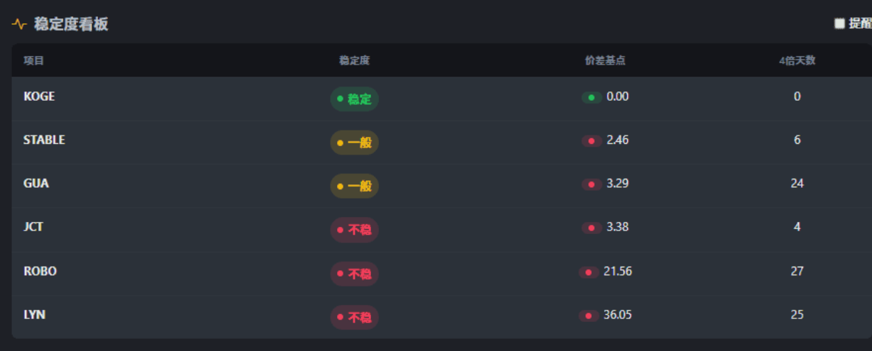 图片里能看到稳定度、价格基点、四倍天数这几个关键指标,优先选择带 4 倍的标的,刷一次抵四次,但潜在波动风险大,一定要等价格稳定后再刷,稳定性是控制成本的关键!