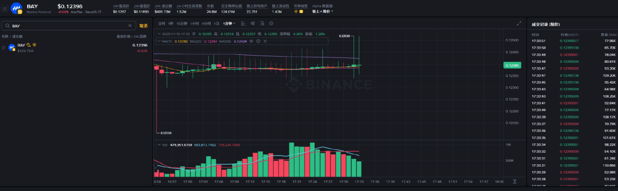 价差基点为 0 的时候是最稳定的状态,找到目标币后,查看 1 分钟 K 线和成交记录,只要 K 线平稳、价格无波动,就可以开刷了。