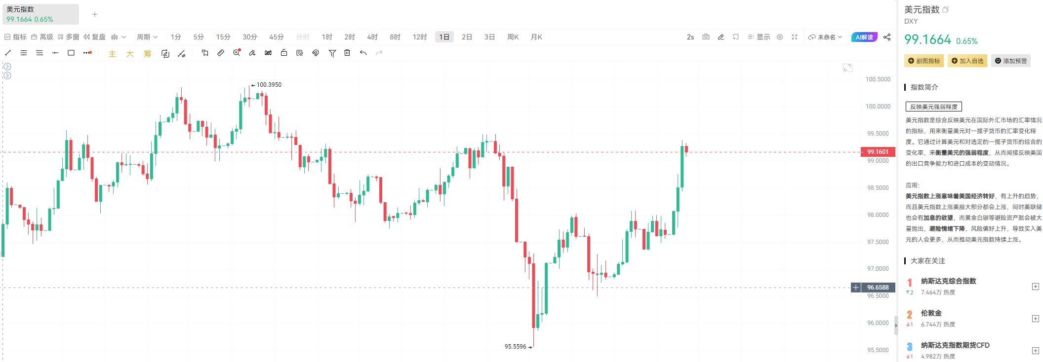 美元指数(DXY)近期一度攀升至99.4,接近三个月新高 。通常情况下,美元走强意味着资金涌向避险资产,风险市场会承压。与此同时,纳斯达克100指数下跌约1%,黄金价格更是单日重挫3.6% 。