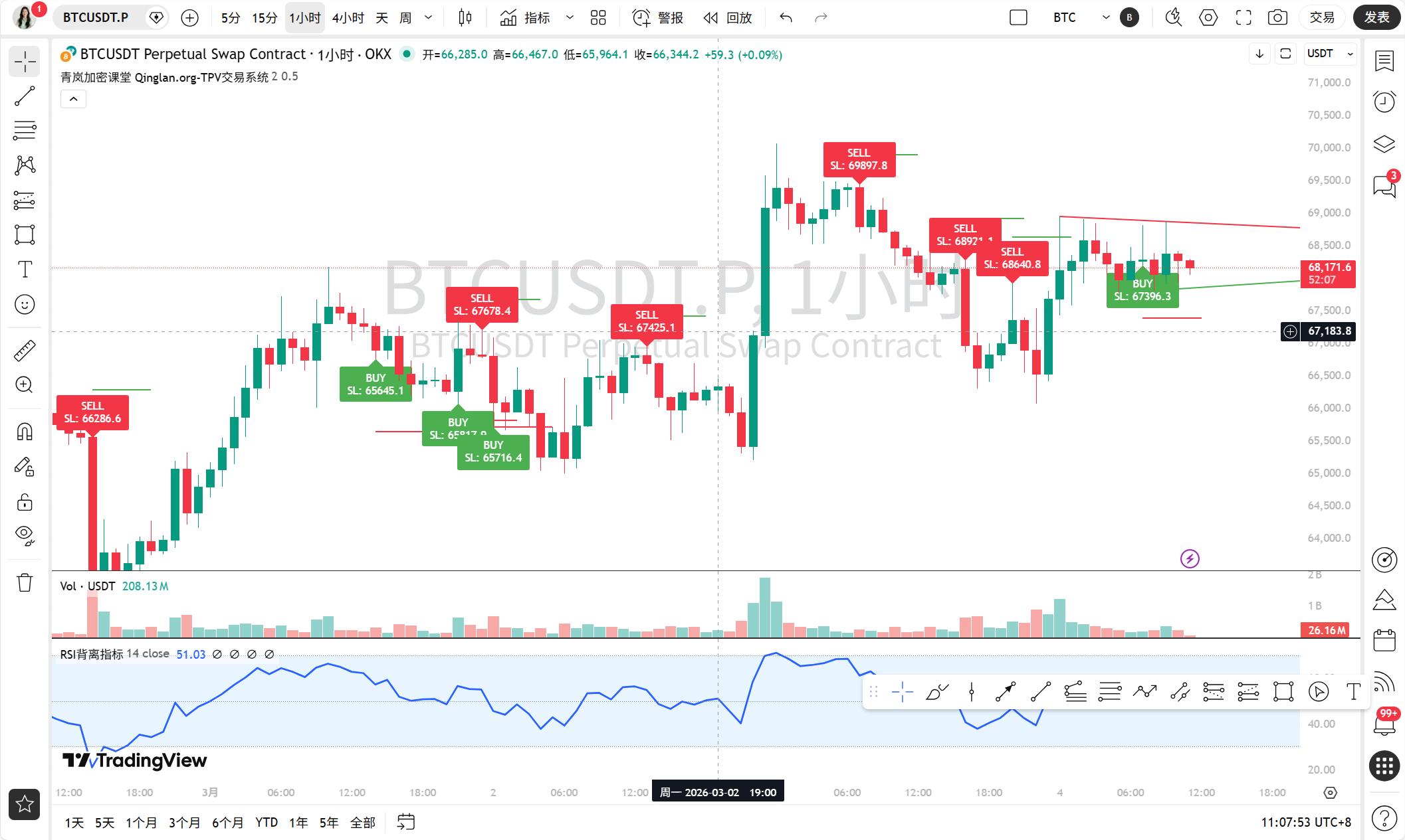 • 4小时图:这是关键周期。价格在67000-69000这个更大的区间内震荡。MA20均线(紫色)是重要的中期支撑,目前价格在其上方。但MACD的情况有点意思:价格在3月2日创下近期高点(接近70000)后,最近的高点(约68900)比之前低,但MACD的DIF线高点却比之前高,这形成了潜在的顶背离雏形,这是个需要警惕的看跌信号。RSI在57左右,还算健康。