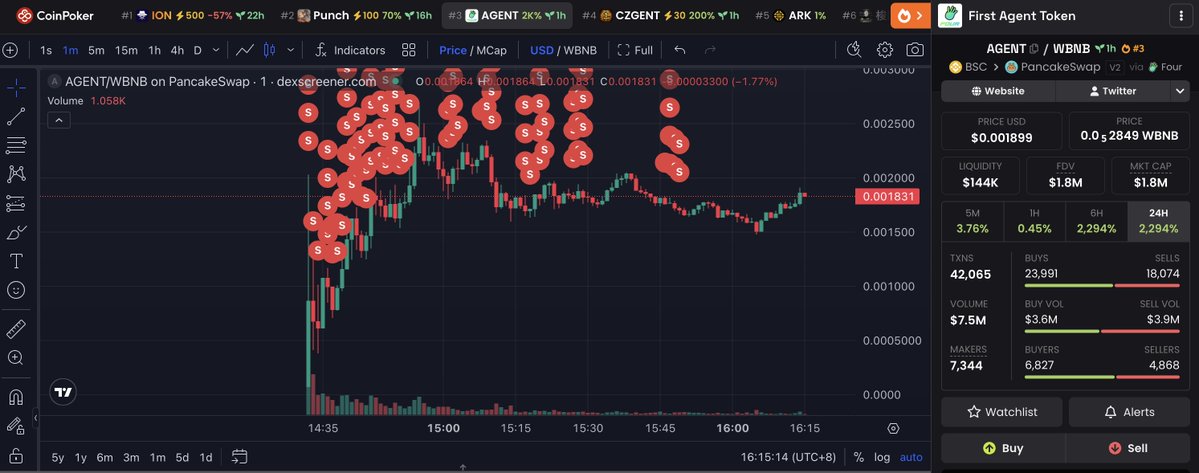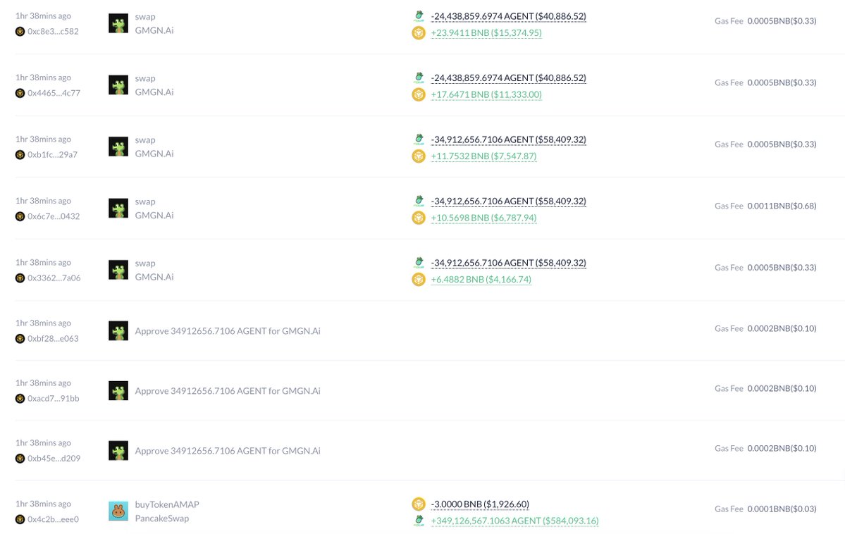 后来他们以610 $BNB($390K)售出了570.12M $AGENT,仍持有58.7M $AGENT($106K)。