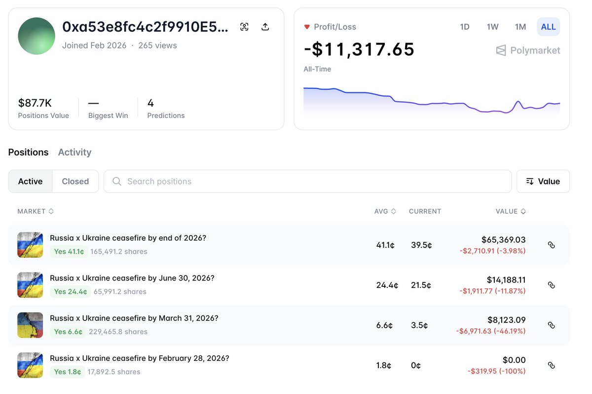 交易者 0xa53e,我们称他为“和平缔造者”,自2月11日加入 #Polymarket 以来,一直在押注俄乌停火。