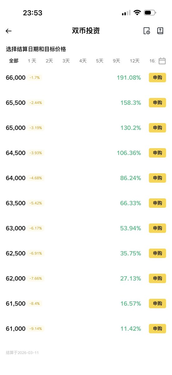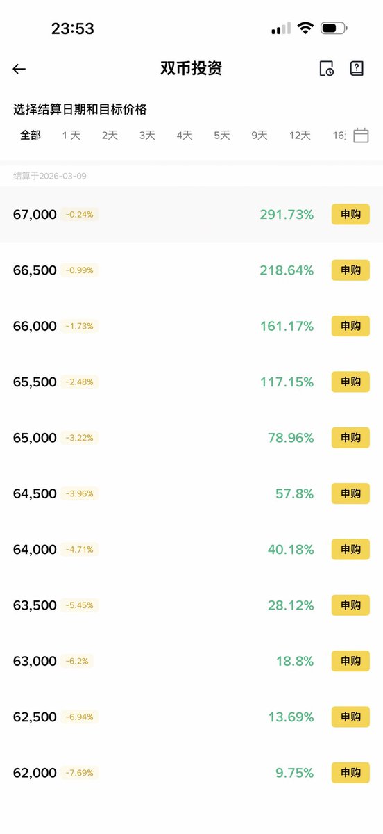 赶在 0 点之前下单,否则时间就会额外 T+1 了,下单时候的 $BTC 价格是 67,211 美元 ,我看了一下,这时候的双币投资到 3月9日 最低是 62,000 美元,只有不到 10% 的收益,而相隔一天的 3月10日 到期,62,000 美元的收益就是 27% 了。