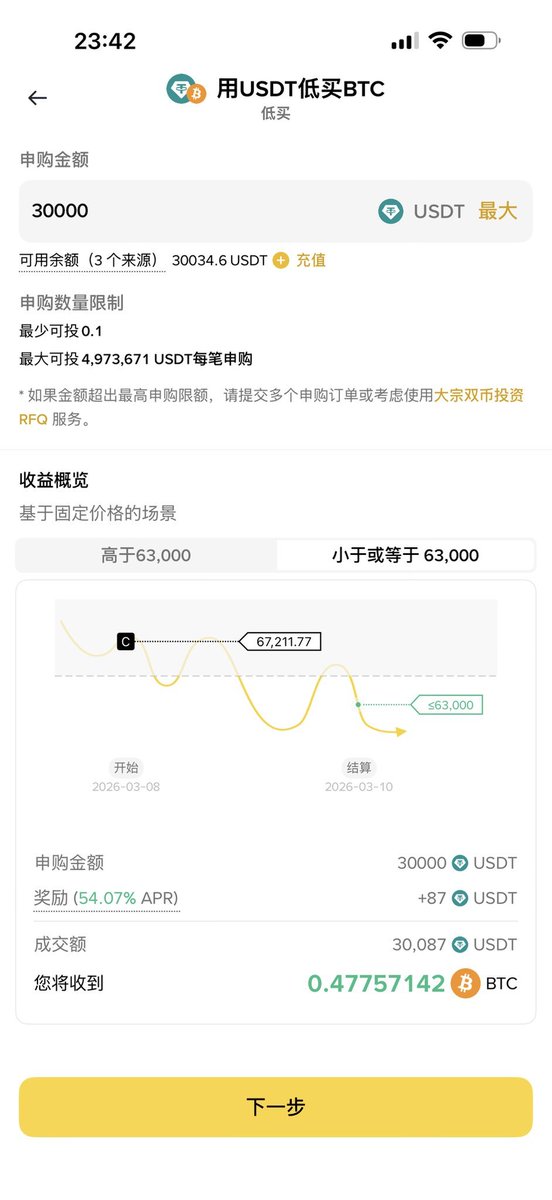 如果到了 3月10日16点 Bitcoin 的价格高于 63,000 美元,那么我就会收到 87 美元,如果到时候 BTC 的价格低于 63,000 美元,我就会拿到 0.4775 枚 BTC ,在差不多的时间我会看,如果觉得 BTC 的价格很危险,那么我就会一倍做空对冲掉。