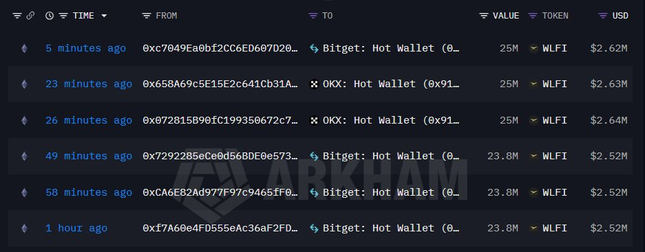 链上分析显示,自 3 月 4 日 开始,WLFI 在连续两天内将大量 WLFI 代币转入中心化交易所:第一天,向 OKX 和 Bitget 合计转入约 1.464 亿枚 WLFI,按当时价格折合约 1540 万美元;第二天,再向 OKX 转入约 1671 万枚,折合约 174 万美元。两次转账合计约 1.63 亿枚代币,总价值超过 1700 万美元。