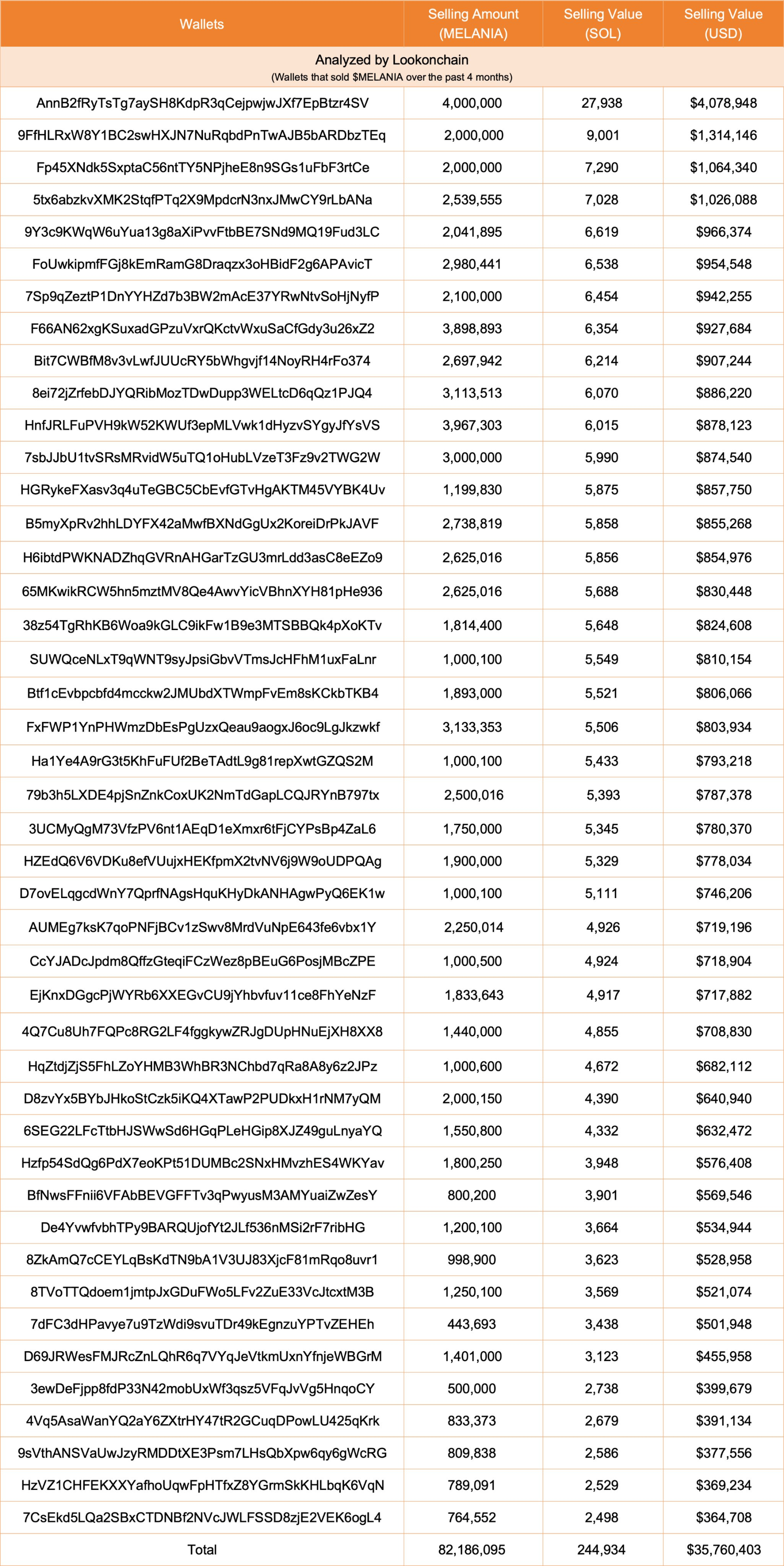 紧随其后,第一夫人梅拉尼娅也发行了自己的代币「MELANIA」,代币上线首日市值突破百亿美元,但随后因内幕抛售迅速崩盘,市值缩水至不足 20 亿美元。2025 年 6 月,据 Lookonchain 监测,特朗普夫人官方 Meme 币 MELANIA 团队在过去 4 个月中,通过 44 个钱包累计抛售了 82.18 万枚 MELANIA(占总供应量的 8.22%),总计套现 244,934 枚 SOL(约合 3576 万美元)。