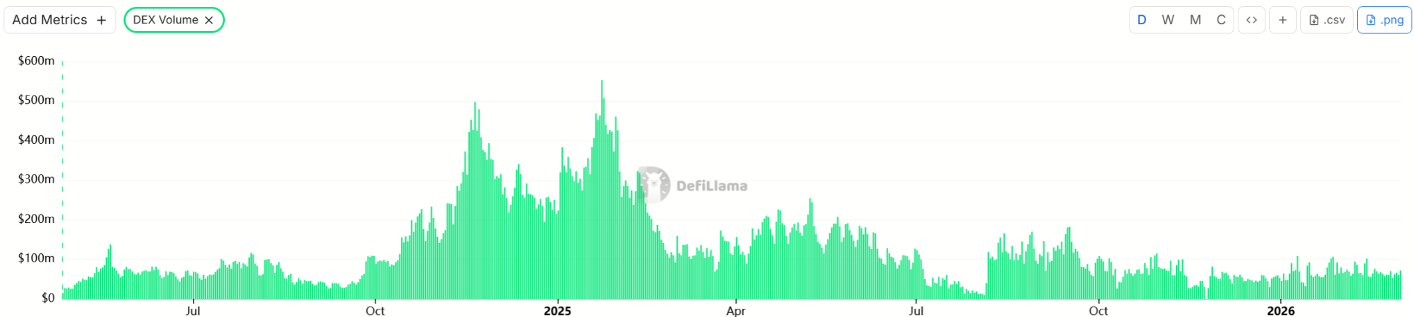 来自 DefiLlama 数据显示,2025 年 1 月即是 Pump.fun 成交额的高光时刻,此后开始大幅下滑,活跃度陡然下降。2025 年 1 月,单日最高成交额能达到 5.5 亿美元,如今则在单日 6000 万美元附近徘徊。