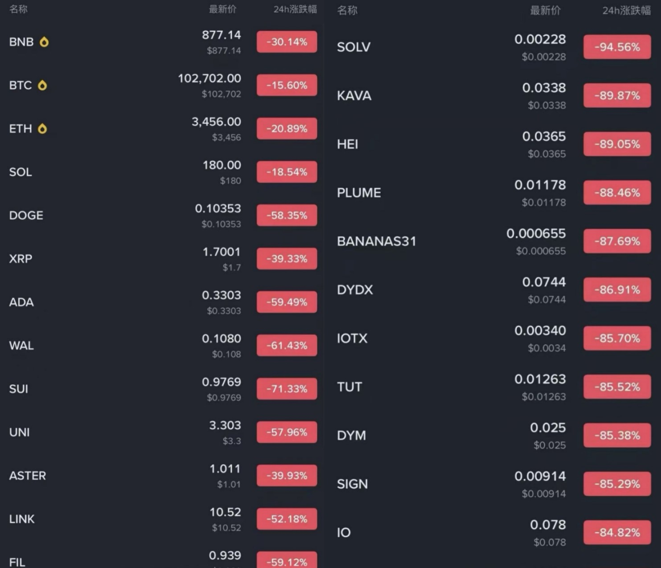 10 月 10 日晚间时候,BTC 不断下跌,自 12 万美元一路下滑,10 月 11 日凌晨 4 时许,市场风云突变,BTC 突然下跌至 11.3 万美元,随后不久下探至 102000 美元。BTC 影响之下,ETH 也随之一度下探至 3435 美元,SOL 一度下探至 168.79 美元,SUI 甚至一度插针至 0.5597 美元,币安交易所上 ATOM 更是跌至 0.001 美元。链上 Gas 也一度飙升至 450 Gwei。Backpack 因行情波动出现故障,交易所 kraken 一度无法访问。