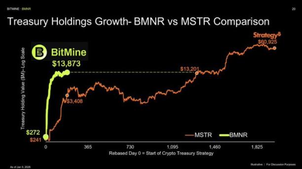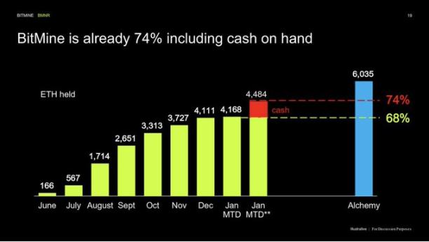 BitMine 董事长 Tom Lee(@funstrat)说的「5% 的炼金术」——拥有以太坊总供应量的 5%。截至 2026 年 1 月 11 日,BitMine 持有 4,167,768 个 ETH,约占全部 ETH 的 3.45%(流通量约 1.207 亿)。仅仅用了六个月的执行,BitMine 就完成了近 70% 的目标。这个巨大的储备让 BMNR 成了全球遥遥领先的最大公开以太坊持有者。这么说吧,BitMine 现在手里的 ETH,比大多数顶级 DeFi 协议都多,超过了像以太坊基金会这样的顶级持有者,也把其他持有加密货币的上市公司远远甩在身后。唯一比它大的公司加密金库是 MicroStrategy 的比特币储备(约 67.2 万 BTC),但在以太坊这个赛道上,BitMine 是独一份的巨鲸。达到完整的 5%(约 600 万 + ETH)还是最终目标,管理层看起来完全没有停下来的意思——最近几周,他们一边在增加现金储备,一边还在继续买入几万几万的 ETH。这种规模感,让人想起伯克希尔在可口可乐或苹果股票上的重仓,只不过这次换成了数字资产。BitMine 高度确信的赌注是:以太坊就是未来的金融网络,拥有它巨大的份额,会巨大的战略和经济好处。