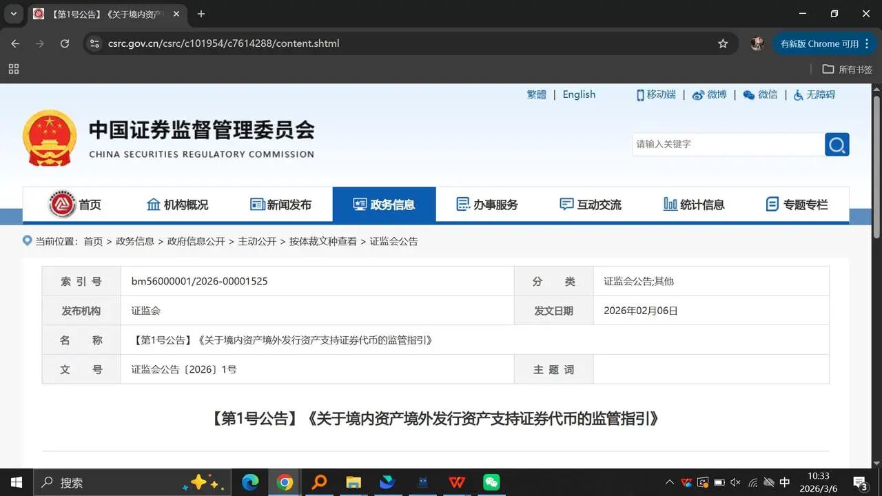 另一边是「开正门」。证监会同步发布《关于境内资产境外发行资产支持证券代币的监管指引》(〔2026〕1号),正式为合规业务放行。