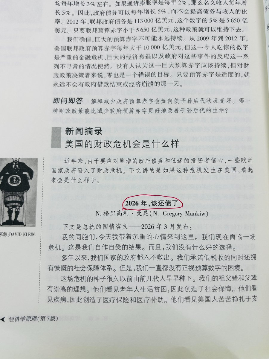 今天看到曼昆的《宏观经济学原理》,这本书里面摘录了曼昆在2011年写的一个预判,也就是15年前写的预言,而且直接把发生危机的日期明确的注明了是2026年。