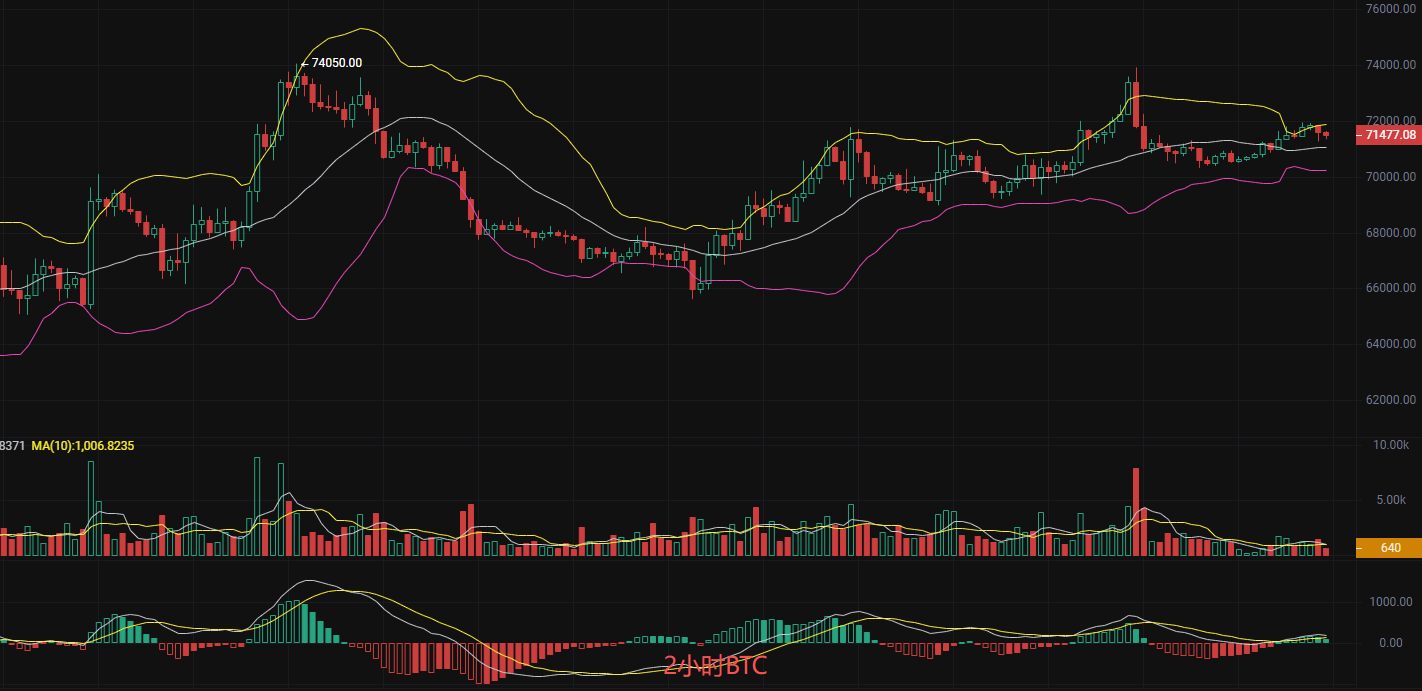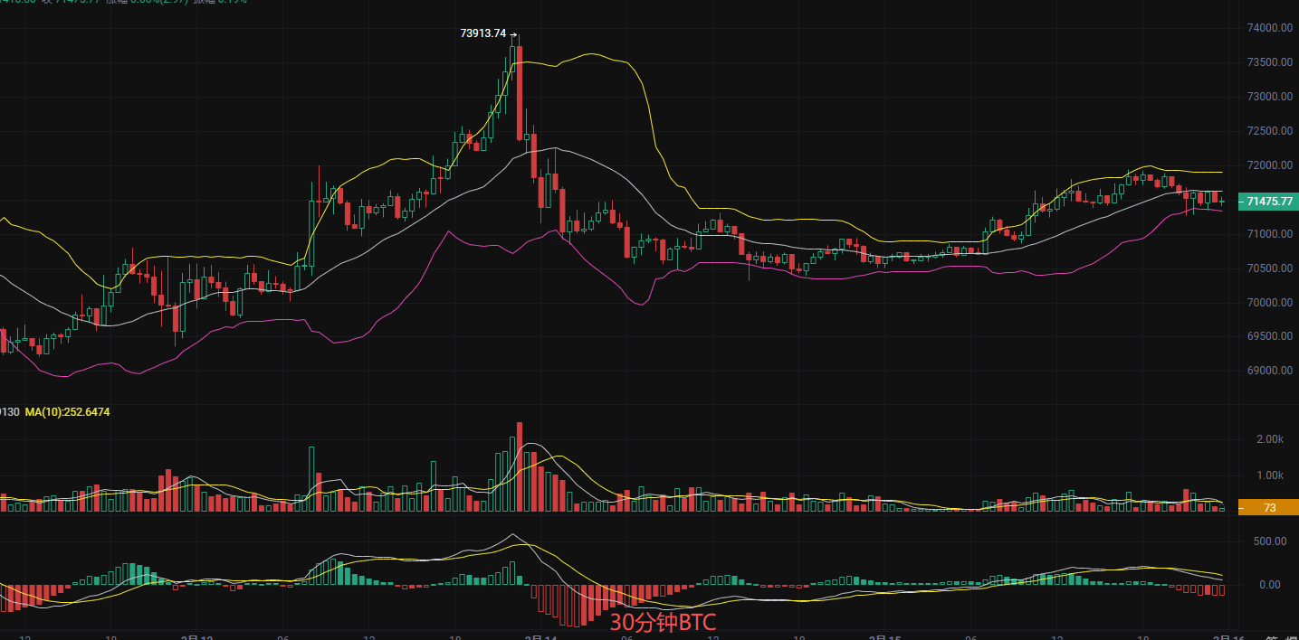 当前2小时布林带呈现极致收敛形态:上轨71914、中轨71080、下轨70246间距极小,几乎贴近这说明短期多空力量势均力敌,市场进入静默期,所有交易者都在等待方向选择。BTC在62510低点时,布林带同样经历极致收缩,随后伴随上轨突破迎来一波暴涨从62510→74050,涨幅超18%。而在74050高点后,布林带再度收窄,价格回调至68000区间,完成收缩-扩张-收缩的周期轮回。