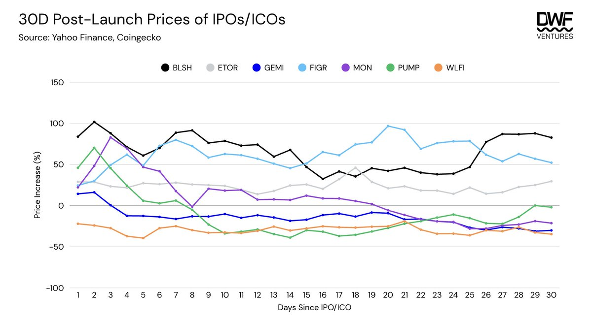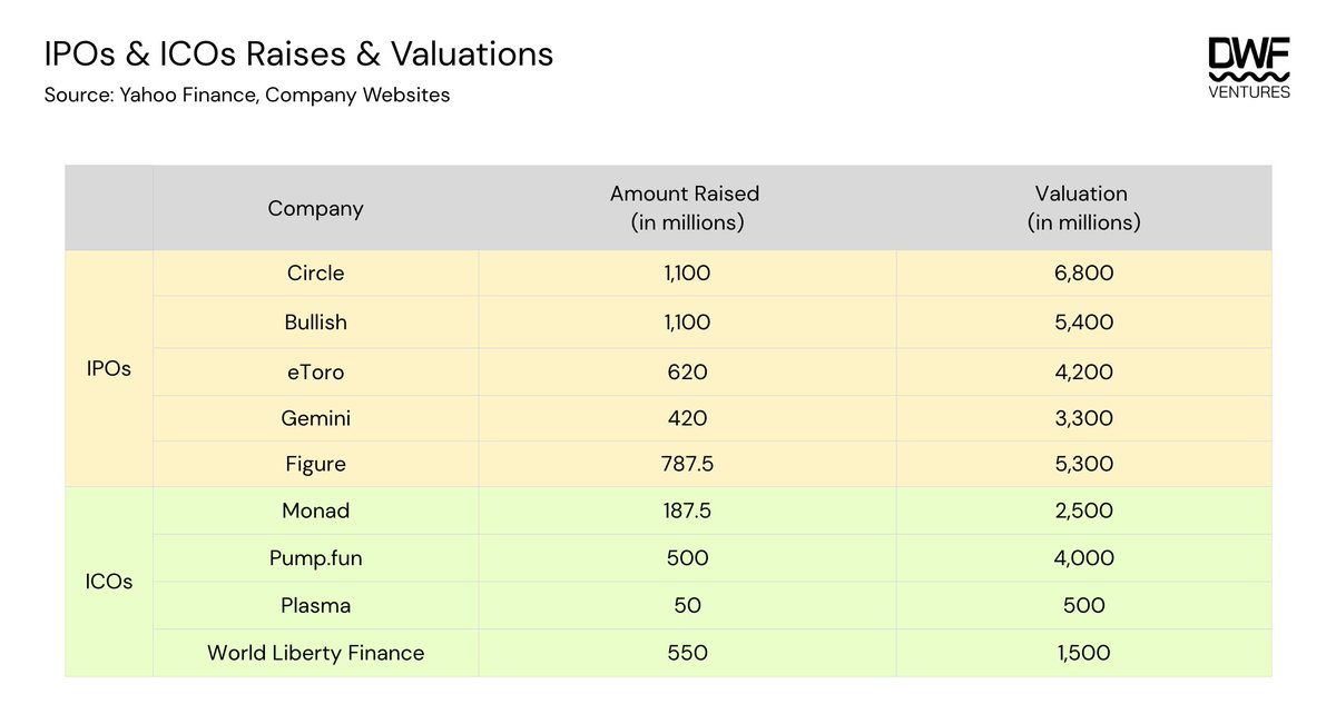 从中我们观察到,IPO和ICO的估值相对接近。某些ICO,如Plasma,是专门以低于机构投资者估值的价格定价,旨在为散户投资者提供更大的上行空间和参与机会。平均而言,IPO的公开股份比例在12%至20%之间,ICO的公开流通比例在7%至12%之间。World Liberty Finance是明显的例外,提供了超过35%的总供应量用于出售。