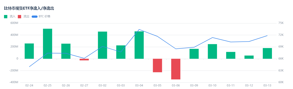 ● ETF的“金流”:更值得注意的是美国现货比特币ETF的表现。数据显示,这些ETF在刚刚过去的一周内,录得了2026年以来首次连续五天的净流入,单周累计吸入资金高达约7.67亿美元 。三月以来,总流入量更是接近13亿美元,有望创下去年十月以来的最佳月度表现 。