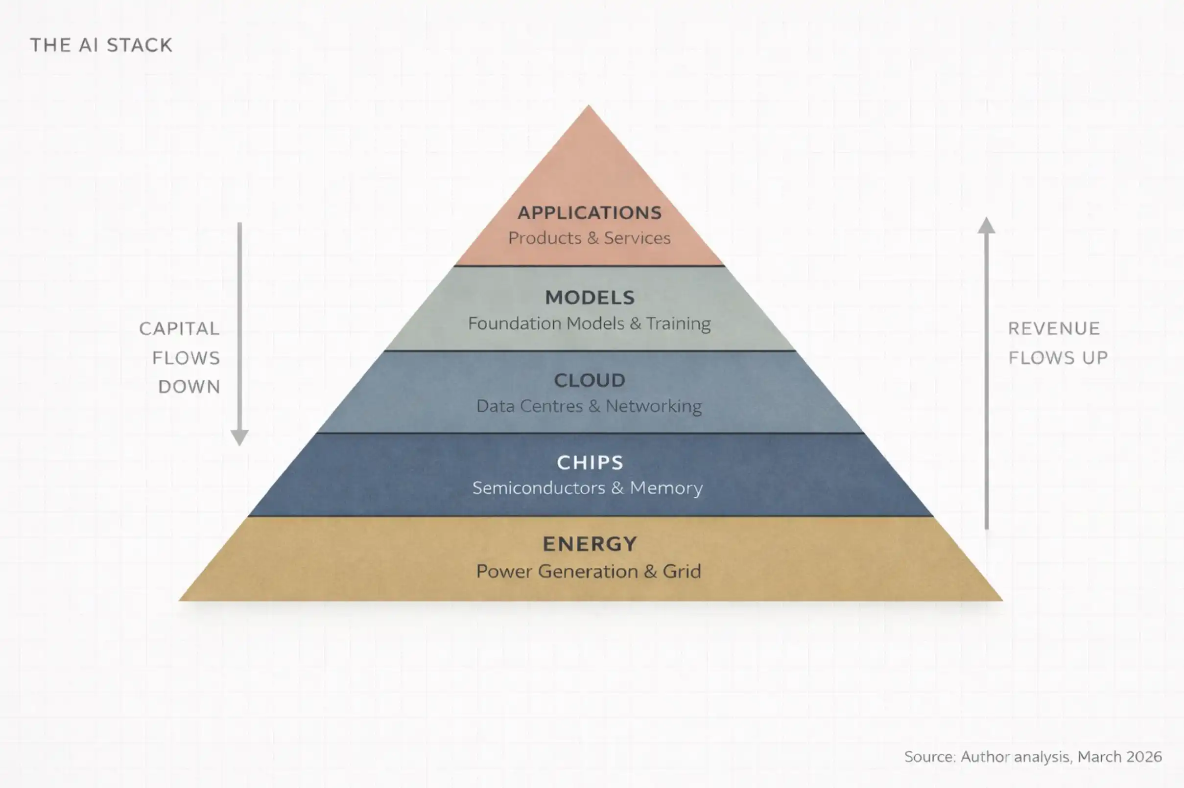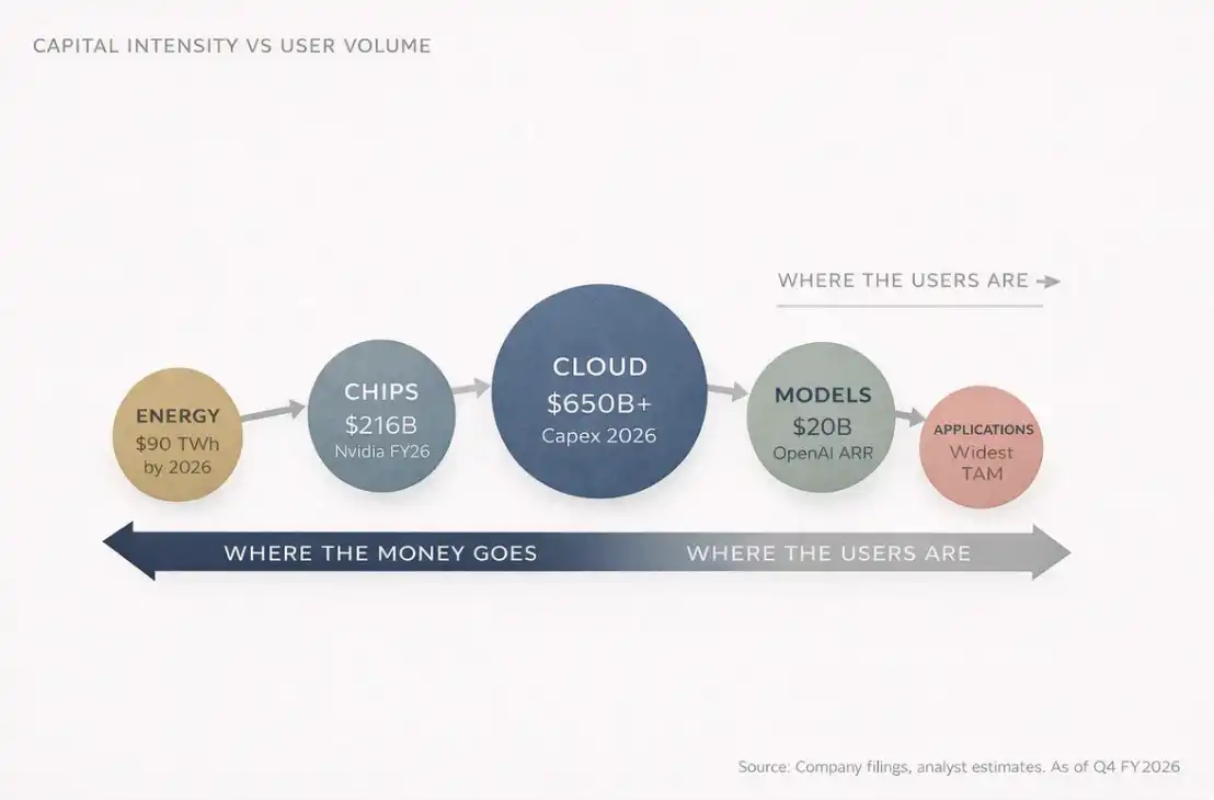 This is the first to third layers: energy, chips, cloud infrastructure—these are the invisible layers where the real capital is being deployed.