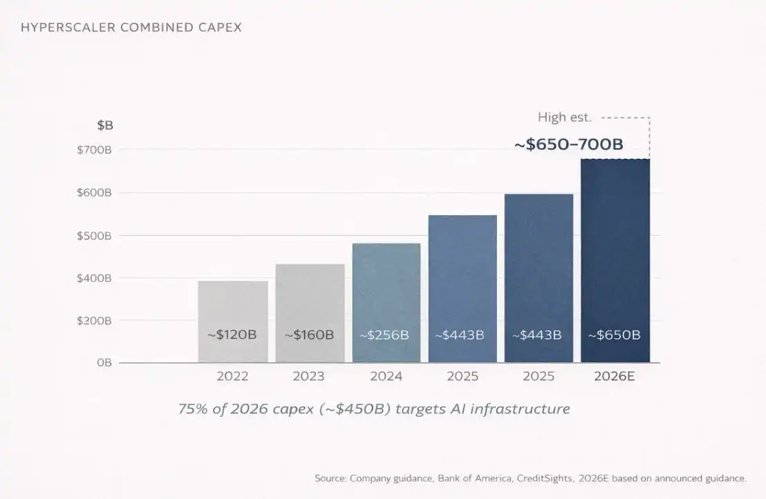 But most people overlook something. By 2026, the four largest cloud computing companies (Amazon, Microsoft, Google, Meta) are expected to reach a total capital expenditure (CapEx) of $650 billion to $700 billion within a year.