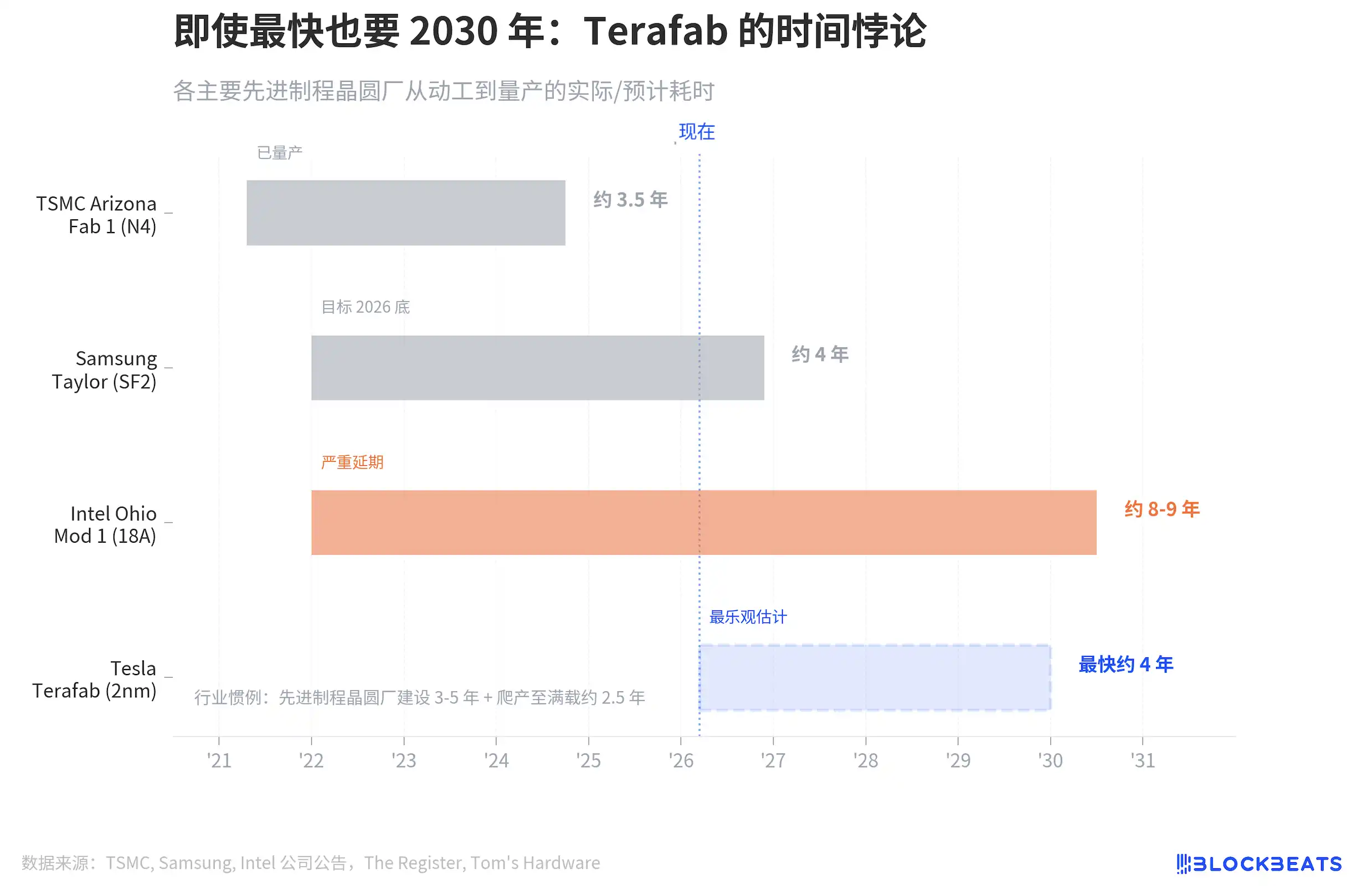 行业惯例是建设 3 到 5 年,加上爬产到满载再要 2.5 年。即使按 TSMC 的速度给 Tesla,Terafab 最快也要 2029 年底才能出片。