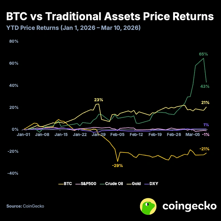 在经历了动荡的 2025 年底后,比特币在 2026 年初继续震荡下跌。与此同时,地缘政治和宏观经济事件推动了黄金、白银以及近期原油价格的上涨。随着加密货币作为一种资产类别继续被主流接纳,许多华尔街投资者可能正在经历他们的第一次加密熊市。Coingecko 审视了 2026 年伊始,加密货币相对于其他传统资产类别的表现。