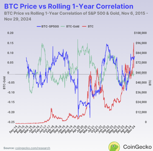 除了波动性,比特币与标普 500 指数和黄金等其他主要资产的关系,可以进一步揭示其独特的行为。相关性分析揭示了比特币如何与传统市场保持同步或脱节: