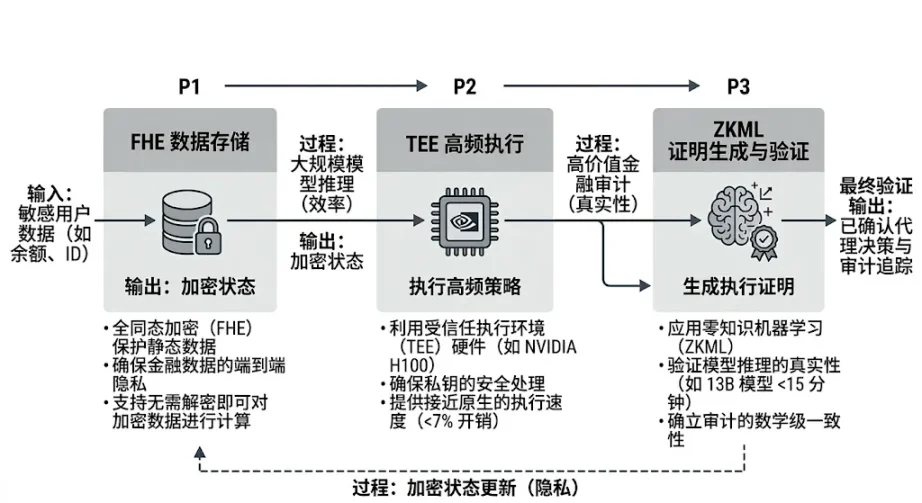 未来的技术趋势并非单一路径的胜出,而是 「混合机密计算」 的全面普及 。在一个完整的 AI 业务流中:利用 TEE 进行大规模、高频的模型推理以保证效率;关键节点通过 ZKML 生成执行证明以确保真实性;敏感的财务状态(如账户余额和隐私 ID)则交由 FHE 进行加密沉淀。